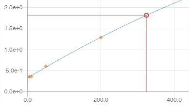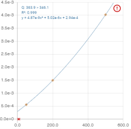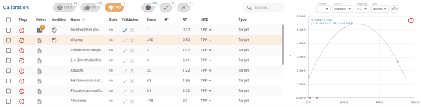 Un clic sur une ligne du tableau permet d’afficher le graphe de calibration du composé dans le Panneau Calibration (le texte