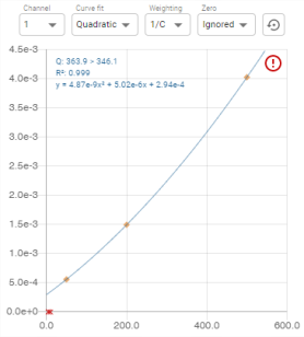 Un clic sur un chromatogramme permet d’afficher le graphe de calibration de l’analyse dans le Panneau Calibration (le texte