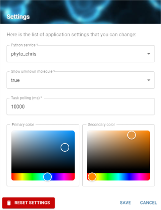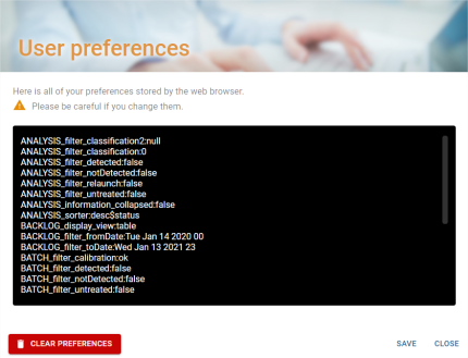 - L’application utilise les cookies du navigateur web afin de sauvegarder les préférences de l’utilisateur tel que les proportions entre les différents panneaux d’une vue, les filtres appliqués sur les listes, la configuration des tableaux, les couleurs de l’interface, la taille des chromatogrammes, l’affichage de la navigation (voir Panneau de préférences utilisateur).