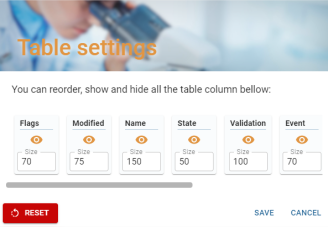 Depuis cette fenêtre il est possible de modifier l’ordre des colonnes de la table (sauf la colonne de sélection si présente), leurs largeurs ainsi que leur visibilité.