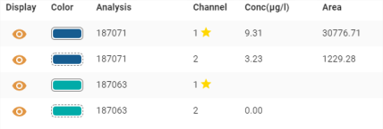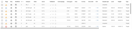 si la sélection est un ISTD), la ligne passe ainsi avec un fond coloré permettant de repérer quel ligne du tableau correspond au graphe affiché. Le __Panneau Chromatogrammes d’analyses__ scroll automatiquement pour visualiser le chromatogramme associé.