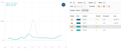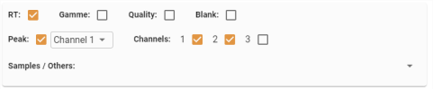 Sur la seconde ligne, on retrouve les filtres appliqués au __Panneau Table d’analyses__ et au __Panneau Chromatogrammes d’analyses__ :