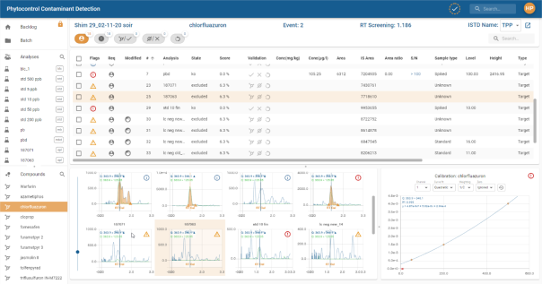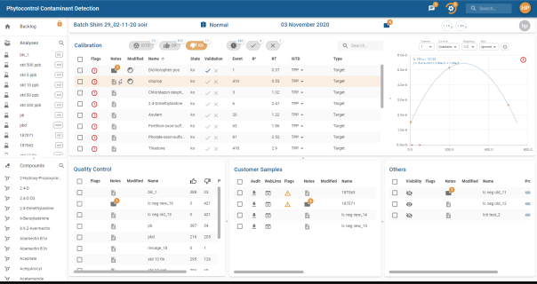 Un clic sur un chromatogramme permet d’afficher le graphe de calibration du composé dans le Panneau Calibration (le texte
